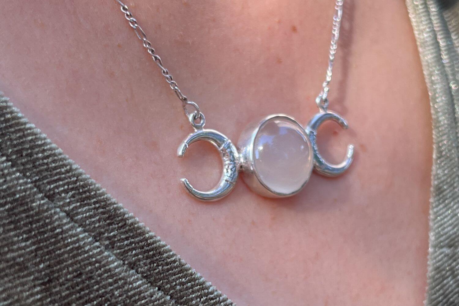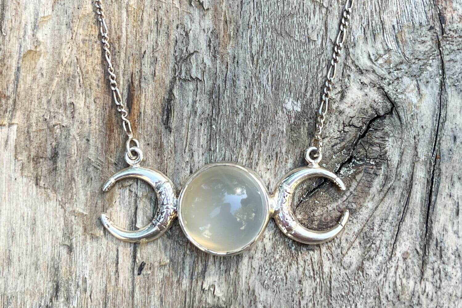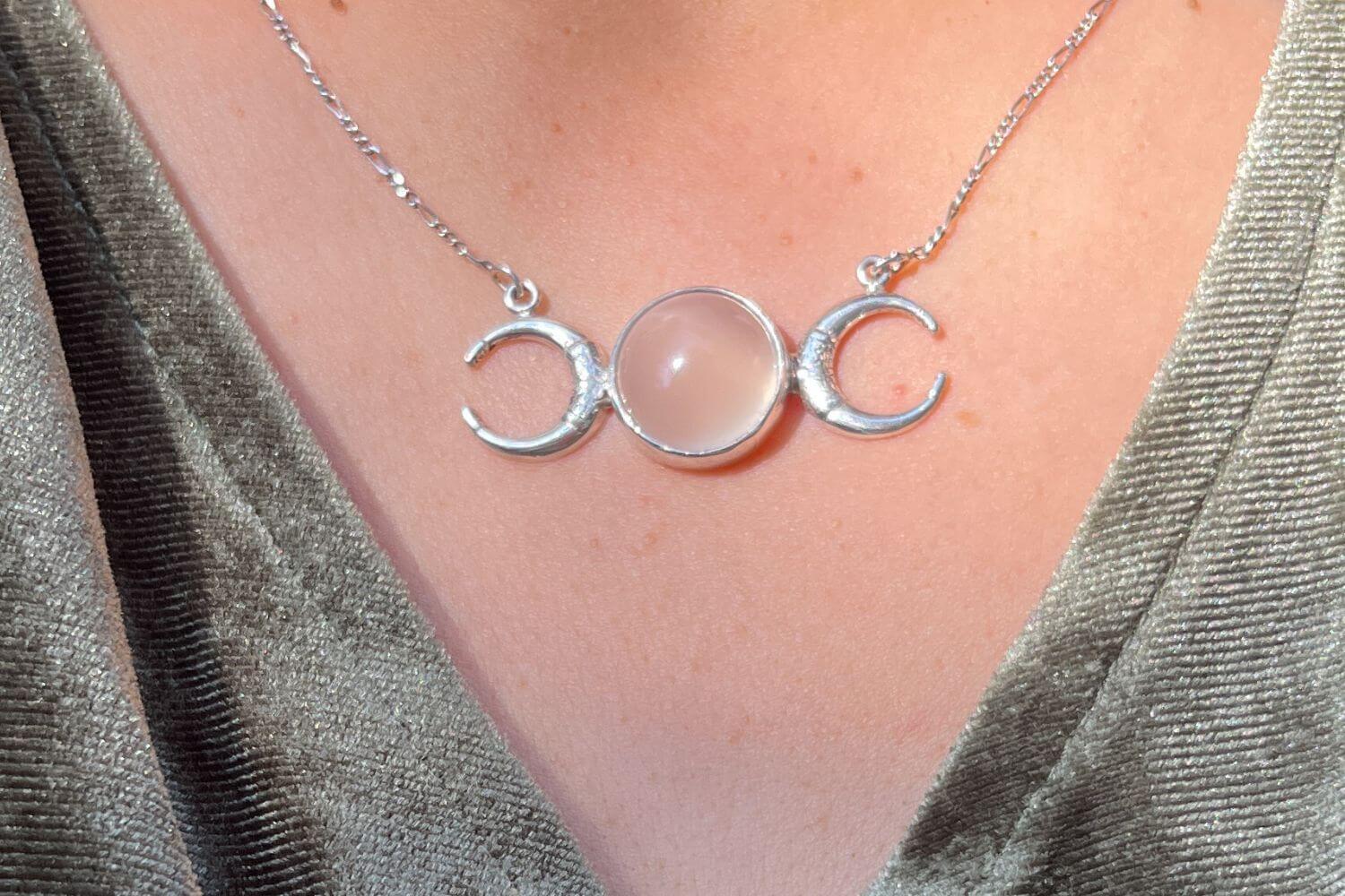 Este colgante Triple Diosa en Plata 950 con Piedra Luna honra la conexión con lo femenino sagrado y los ritmos naturales de la vida. La Triple Diosa —Doncella, Madre y Anciana— simboliza los ciclos de crecimiento, creación y sabiduría, mientras que la Piedra Luna potencia la intuición, la calma emocional y la conexión espiritual.